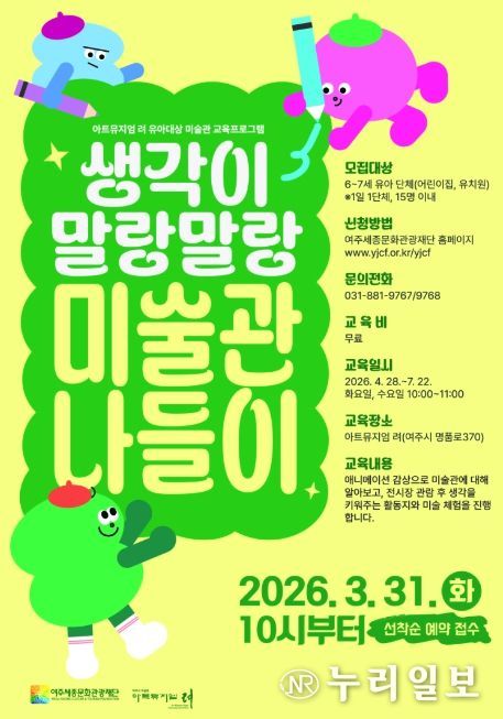 (누리일보) 여주세종문화관광재단은 유아를 대상으로 하는 미술관 교육프로그램 '생각이 말랑말랑, 미술관 나들이'를 오는 4월부터 10월까지 아트뮤지엄 려에서 운영한다고 밝혔다.