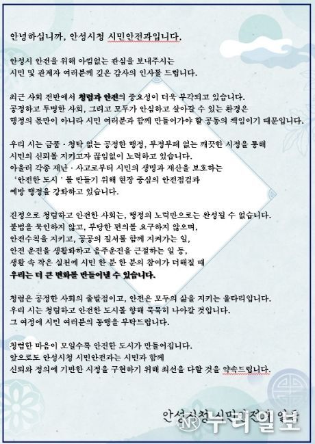 (누리일보) 안성시는 각종 안전점검 과정에서 청렴 안내문을 배부하는 ‘청렴한 안전점검’을 추진하며 시민 청렴의식 제고에 나선다.