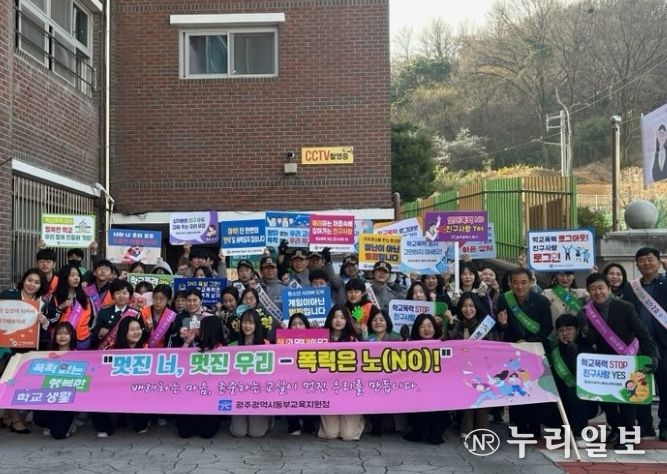 (누리일보) 광주광역시동부교육지원청은 24일 등교시간에 북구 양산중학교 교문 앞에서 ‘등굣길 학교폭력 예방 캠페인’을 전개했다.