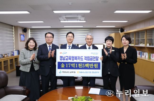 (누리일보) 경상남도교육청은 24일 NH농협은행으로부터 ‘경남교육행복카드’ 사용으로 적립된 포인트 17억 1,585만 6,930원을 전달받았다.