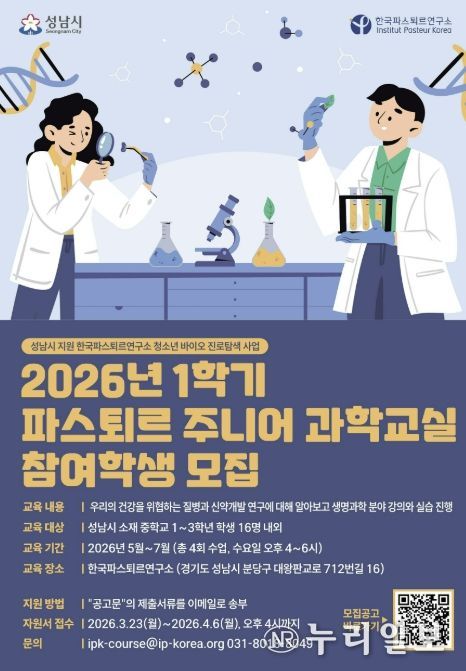(누리일보) 성남시는 2026년 상반기 한국파스퇴르연구소 ‘파스퇴르 주니어 과학교실’ 참여 학생을 모집한다.