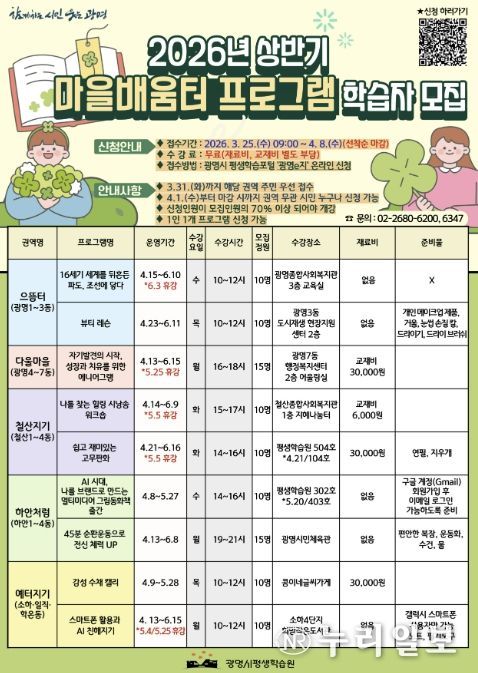 (누리일보) 광명시가 시민들이 생활권 내에서 평생학습을 누릴 수 있도록 ‘2026년 상반기 권역별 마을배움터 프로그램’ 수강생을 오는 4월 8일까지 모집한다.