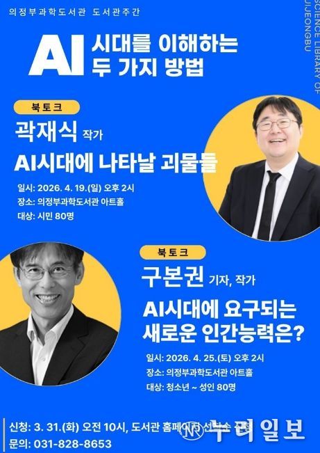 (누리일보) 의정부과학도서관은 ‘제62회 도서관주간’과 ‘제4회 도서관의 날’을 맞아 4월 19일부터 30일까지 ‘AI 시대를 이해하는 두 가지 방법’을 주제로 시민 대상 작가 북토크를 개최한다.