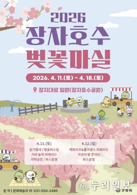 (누리일보) 구리시는 오는 4월 11일부터 18일까지 8일간 장자대로 일원(장자호수공원)에서 ‘2026 장자호수 벚꽃마실’을 개최한다고 밝혔다.