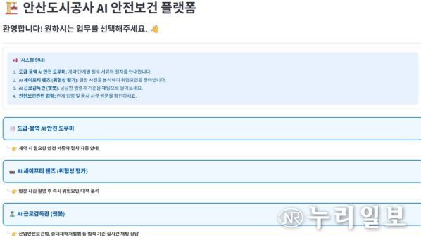 (누리일보) 안산도시공사는 생성형 인공지능(AI) 기술을 접목한 ‘AI 안전보건 플랫폼’을 자체 개발해 현장 사고 예방 업무에 본격적으로 활용한다고 25일 밝혔다.