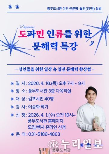 (누리일보) 김포시 풍무도서관은 도서관주간을 맞아 오는 4월 16일 오후 7시부터 야간 인문학 프로그램으로 ‘도파민 인류를 위한 문해력 특강’을 운영한다.