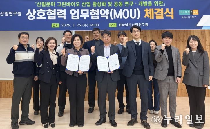 (누리일보) 전라남도산림연구원이 25일 ㈜현대바이오랜드와 산림자원을 활용한 그린바이오 산업 활성화를 위해 업무협약을 하고, 고부가가치 제품 개발과 원물의 안정적 생산체계 구축을 위한 상호 협력에 나섰다.