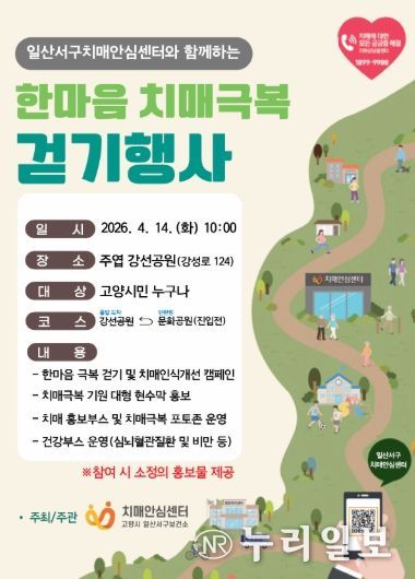 (누리일보) 고양특례시 일산서구보건소는 오는 4월 14일 주엽동 강선공원 일원에서 ‘한마음 치매극복 걷기 행사’를 개최한다.