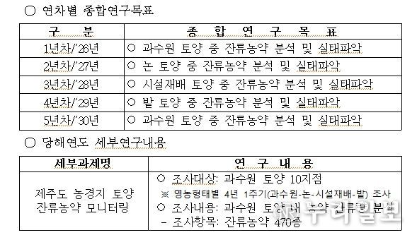 이를 통해 농약허용기준강화제도(PLS)에 대응한 농업환경 안전성 관리 방안의 기초 자료를 마련하고, 잔류농약의 사전 예방을 위한 안전성 관리방안을 제시할 방침이다.