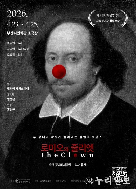 (누리일보) (재)부산문화회관(대표이사 차재근)은 오는 4월 23일부터 25일까지 3일간 부산시민회관 소극장에서 연극 '로미오와 줄리엣 The Clown〉을 선보인다. 이 작품은 2024년 제45회 서울연극제 자유경연작 최우수상 수상작으로 예술성과 완성도를 동시에 인정 받으며 관객과 평단의 호평을 받은 작품이다.