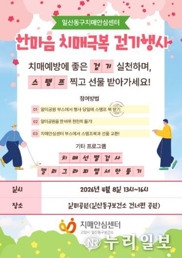 (누리일보) 고양특례시 일산동구보건소 치매안심센터에서는 치매에 대한 사회적 공감대 형성 및 치매 친화적 사회를 조성하고자 한마음 치매극복 걷기 행사를 오는 4월 8일 백석동 알미공원(일산동구 중앙로 1087-2)에서 진행한다.