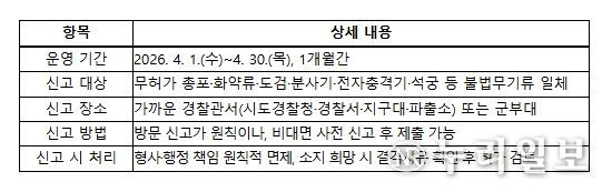 (누리일보) 경찰청은 불법무기류로 인한 범죄와 사고를 미리 방지하기 위하여 국방부 및 행정안전부와 합동으로 4월 1일부터 30일까지 한 달간 '2026년 1차 불법무기류 자진신고 기간'을 운영한다.