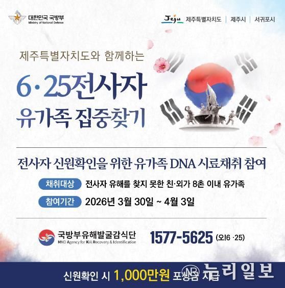 (누리일보) 국방부 유해발굴감식단은 3월 30일부터 4월 3일까지 5일간 제주특별자치도 전역에서 6·25 전사자의 유가족을 찾기 위한 ‘유가족 집중 찾기’ 활동을 전개한다.