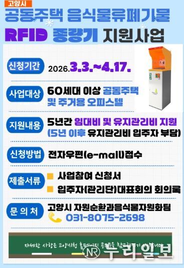 (누리일보) 고양특례시는 음식물류폐기물 감량 및 효율적인 배출 환경 조성을 위해 ‘2026년 음식물류폐기물 RFID 종량기 지원사업’의 지원대상을 확대하고 신청 기간을 연장했다고 30일 밝혔다.