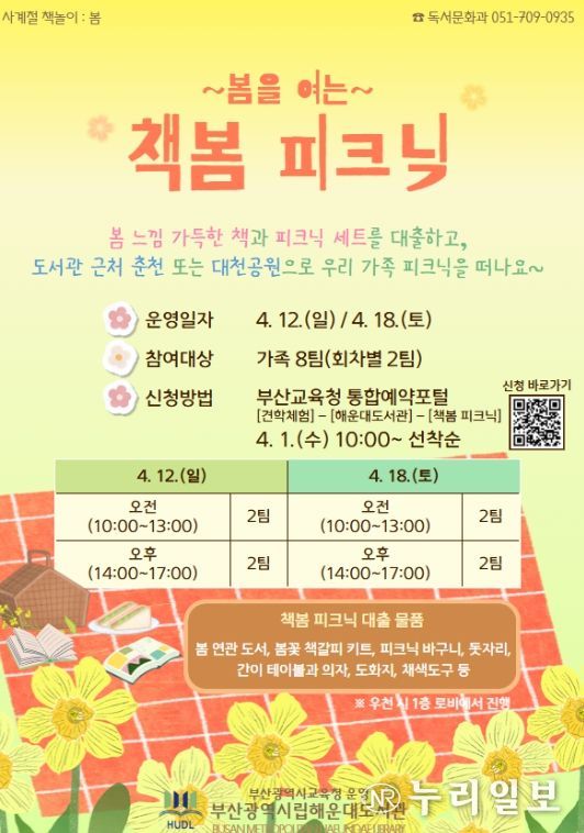 (누리일보) 부산광역시립해운대도서관은 오는 4월 12일과 18일 해운대도서관 인근 자연 공간에서 가족 8팀을 대상으로 봄 야외 독서문화행사 ‘봄을 여는 책봄 피크닉’을 운영한다.