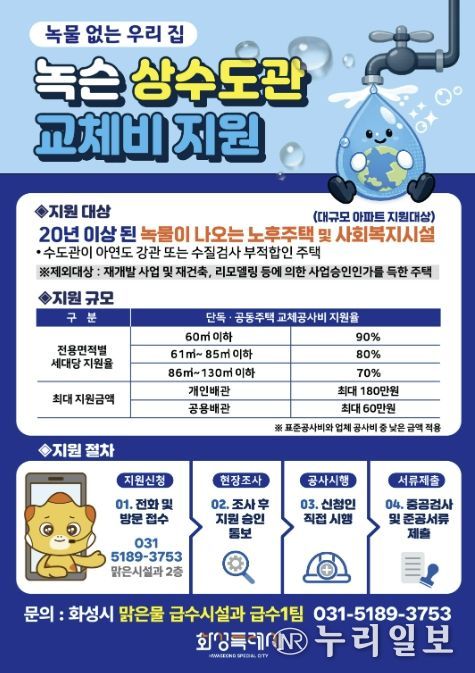 (누리일보) 화성특례시는 쾌적한 주거환경 조성과 안전한 식수 환경 개선을 위해 ‘2026년 녹물 없는 우리집 수도관 개량 지원사업’을 추진한다.
