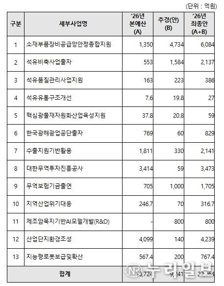 산업통상부는 중동전쟁 위기 극복을 위해 금번 추가경정예산안에 ▲석유·핵심 전략자원의 공급망 안정화, ▲수출기업 비용 경감 및 석유화학 등 피해산업 지원, ▲제조 AX 대전환 등 3대 분야, 총 9,241억원을 편성했다.
