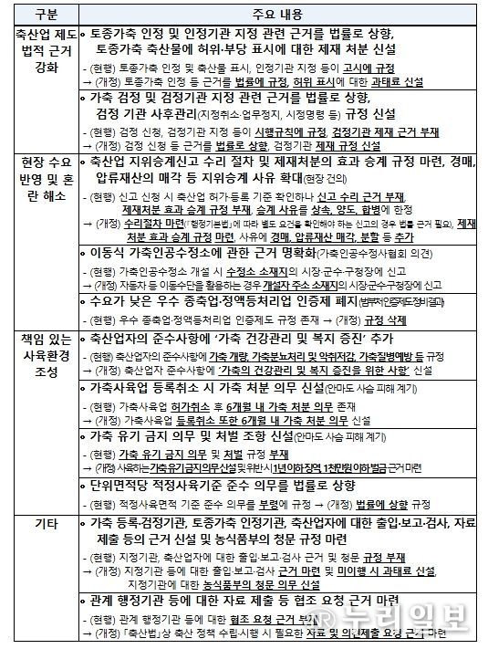 이번 개정은 축산업의 지속 가능한 발전을 도모하기 위해 ▲가축 유기 방지 등 책임 있는 사육 환경을 조성하고, ▲토종가축 표시의 신뢰성을 제고하는 한편, ▲지위승계 제도 개선, ▲이동형 가축인공수정소 신고 기준 개선 등 현장 중심의 제도 정비에 중점을 두었다. 이번 개정된 법률은 공포 후 1년이 경과한 ’27년 4월부터 시행될 예정이다.