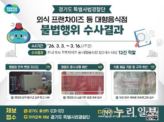(누리일보) 경기도 특별사법경찰단은 지난 3월 3일부터 16일까지 도내 외식 프랜차이즈 등 대형음식점 120개소를 대상으로 집중 수사를 실시한 결과 영업장 면적 변경 미신고 및 영업자 준수사항 위반 등 총 12건의 불법행위를 적발했다.
