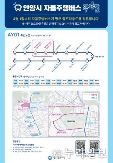 현재 무상으로 운영되는 '주야로'는 경기도 통합교통플랫폼 '똑타' 앱으로 사전 예약하거나, 정류장에서 별도의 예약 없이 바로 탑승할 수 있다. 포털 사이트 지도나 버스 정보 앱에서 노선 번호 'AY01'을 검색하면 실시간 버스 위치도 확인 가능하다.
