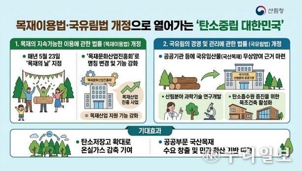이번 법률 개정은 목재산업·문화 확산을 위한 정책을 강화하고, 국산 목재 수요 창출 효과를 이끌어 탄소저장고를 확대하고 국가 온실가스 감축목표에 기여할 것으로 기대된다.