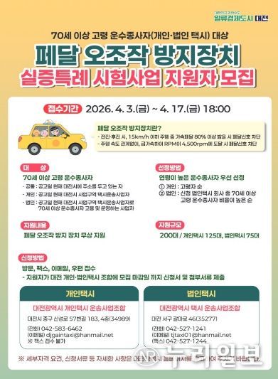 (누리일보) 대전시는 고령 운전자의 급발진 교통사고를 예방하기 위해 ‘페달오조작 방지장치 실증특례 시범사업’을 추진하고, 고령의 택시 운전자를 대상으로 지원자를 모집한다.