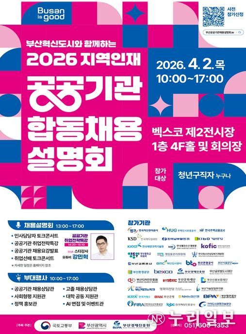 (누리일보) 부산시는 오늘(2일) 오후 2시 벡스코 제2전시장에서 부산 혁신도시와 함께하는 '2026 지역인재 공공기관 합동채용설명회'를 개최한다고 밝혔다.
