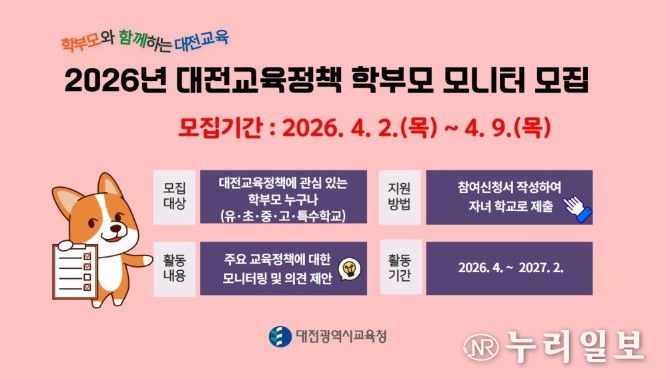 (누리일보) 대전시교육청은 2026년 대전 교육 정책 학부모 모니터를 4월 2일부터 9일까지 각급 학교 학부모를 대상으로 모집한다고 밝혔다.