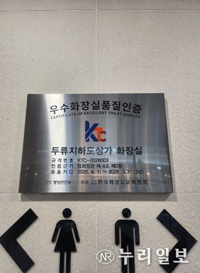 (누리일보) 대구공공시설관리공단은 지난 1일 두류지하도상가 화장실이 행정안전부 주관 한국화장실문화협회로부터 ‘우수화장실 품질인증’을 획득했다고 밝혔다.