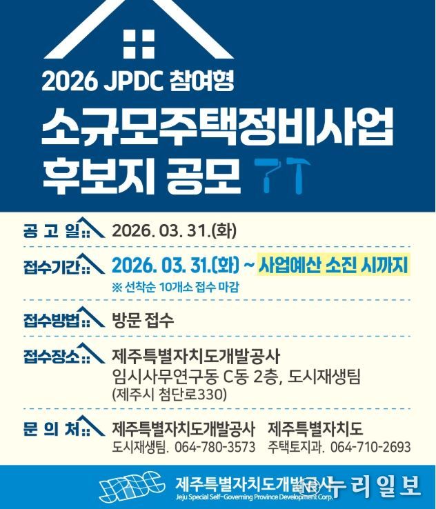 (누리일보) 제주특별자치도와 제주특별자치도개발공사(사장 백경훈)는 대규모 정비사업 추진이 어려운 노후 주거지의 환경을 개선하고, 양질의 주택공급을 확대하기 위해 작년에 이어 올해에도 ‘JPDC참여형 소규모주택정비사업 신규 후보지 발굴 공모’를 실시한다고 밝혔다.