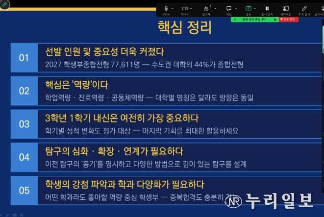 컨설팅은 고등학교 3학년을 대상으로, 좋은일코칭연구소 김병식 대표와 함께 진행했다. 이날 학생들에게 2027학년도 대입 학생부 종합 전형의 특성과 대학 평가 시스템 등을 이해하기 쉽게 설명했다.
