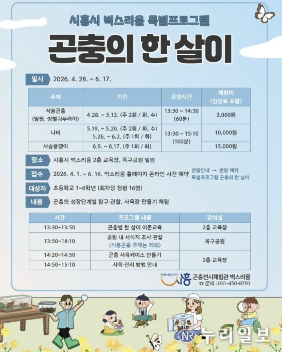 (누리일보) 시흥시 곤충체험전시관 ‘벅스리움’은 오는 4월 28일부터 6월 17일까지 초등학생을 대상으로 특별프로그램 ‘곤충의 한 살이’를 운영한다.