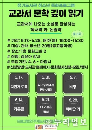 (누리일보) 김포시 장기도서관은 청소년의 독서력과 논술력 향상을 위해 '교과서 문학 깊이 읽기' 프로그램을 오는 5월 17일부터 6월 28일까지 진행한다.