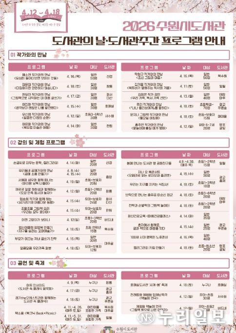 (누리일보) 수원시도서관이 제62회 도서관주간(4월 12~18일)을 맞아 ‘도서관 속 작은 펼침, 세상을 여는 큰 열림’을 주제로 다양한 독서문화 프로그램을 운영한다.