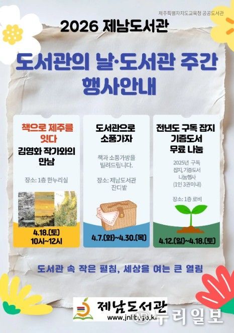 (누리일보) 제주도교육청 제남도서관은 12일부터 도서관의 날과 도서관주간을 맞아 지역주민과 함께하는 다양한 독서문화 프로그램을 운영한다.