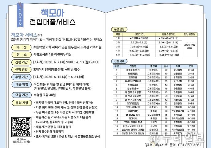 (누리일보) 동두천시 시립도서관은 2026년 4월부터 12월까지 ‘책모아’ 전집 대출 서비스를 총 5회에 걸쳐 운영한다고 밝혔다.