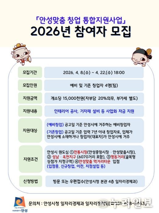 (누리일보) 안성시는 오는 4월 8일 수요일부터 22일 수요일까지 ‘2026년 안성맞춤 창업 통합지원사업’ 참여자를 모집한다. 이번 사업은 전통시장과 골목상권에 창업을 유도함으로써 지역 상권을 활성화하고, 이를 차세대 문화·관광 자원으로 발전시키기 위해 기획됐다.