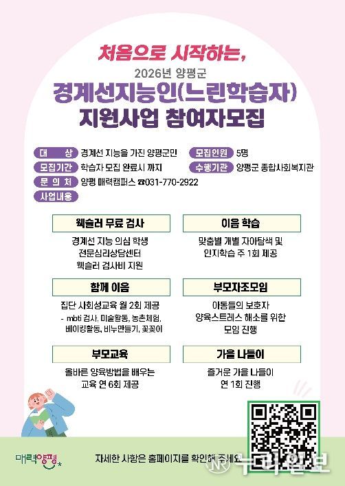 (누리일보) 양평군은 2026년 처음으로 추진하는 ‘경계선지능인(느린학습자) 평생학습 지원 사업’에 참여할 학습자를 4월부터 본격 모집한다고 밝혔다.