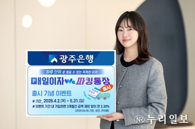 (누리일보) 광주은행은 예비 자금의 입출금이 자유로우며, 하루만 맡겨도 이자를 받을 수 있는 ‘매일이자Wa파킹통장’을 4월 2일에 출시했다고 밝혔다.