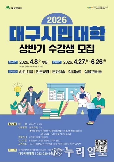 (누리일보) 대구광역시는 시민의 평생학습 기회를 확대하고 변화하는 학습 수요를 반영해 4월 8일부터 ‘2026년 상반기 대구시민대학’ 수강생을 모집한다.
