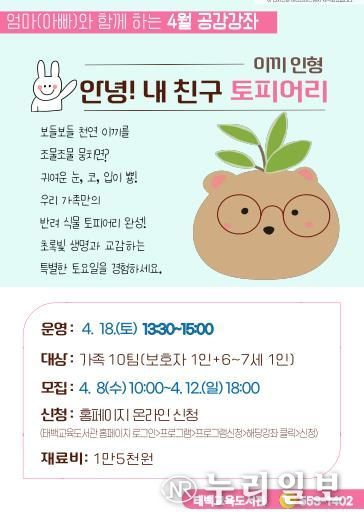 (누리일보) 태백교육도서관은 4월 18일 오후 1시 30분 태백교육도서관 1층 다목적실에서 6~7세 자녀와 부모로 구성된 가족 10팀, 총 20명을 대상으로 4월 공감강좌 ‘안녕! 내 친구 토피어리’를 운영한다.