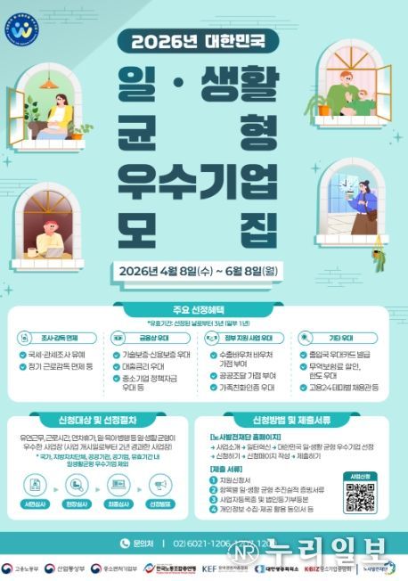 (누리일보) 노동자의 일·생활 균형을 적극적으로 실천하는 기업이 인재 확보에 성과를 거두고 있다. 고용노동부는 이러한 우수사례 확산을 위해 산업통상부, 중소벤처기업부, 한국노동조합총연맹, 한국경영자총협회, 대한상공회의소, 중소기업중앙회와 함께 「대한민국 일・생활 균형 우수기업」을 4월 8일부터 모집한다고 밝혔다.