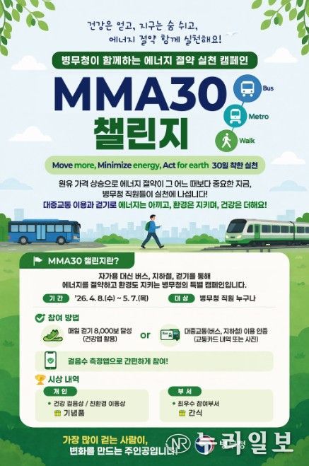 (누리일보) 병무청은 최근 원유 가격 상승으로 에너지 절약에 대한 관심이 높아진 가운데 전 직원이 동참하는 'MMA30 챌린지' 실천 운동을 진행한다.