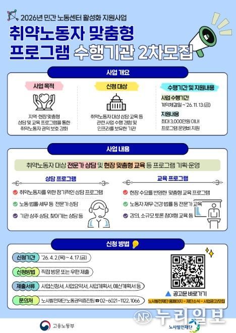 (누리일보) 노사발전재단은 지역별 특성과 취약노동자의 다양한 노동 환경을 반영한 맞춤형 지원을 확대하기 위해 '2026년 취약 노동자 맞춤형 프로그램' 수행기관 2차 공모를 추진한다고 밝혔다.