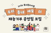 (누리일보) 북수원·대추골·일월도서관은 시민 참여 문화공연 ‘우리동네 예술 터’에 참여할 재능기부 공연팀을 4월 30일까지 모집한다. 모집 대상은 수원시 예술 동아리와 단체, 예술인으로 개인과 단체 모두 신청할 수 있다. 모집 분야는 ▲음악 ▲무용 ▲연극 등 다양한 장르의 공연이며, 지역 주민과 함께 나눌 수 있는 재능기부 형태의 공연이어야 한다. 정치적·종교적·영리 목적의 공연은 제외한다. 선정된 공연팀은 5월부터 12월까지 북수원·대추골·일월도서관 강당 등에서 공연할 수 있으며, 도서관은 공연 공간을 제공한다. 수원시 관계자는 “이번 사업은 이웃의 재능을 나누며 도서관을 소통의 공간으로 만드는 데 의미가 있다”며 “지역 예술인에게는 무대를, 시민에게는 문화 향유 기회를 제공하는 만큼 많은 참여를 바란다”고 말했다.