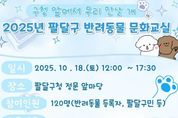 (누리일보) 수원시 팔달구는 10월 18일 오후 12시부터 17시 30분까지 팔달구청 정문 앞마당에서 ‘2025년 팔달구 반려동물 문화교실’을 개최한다고 밝혔다. 반려동물 문화교실은 성숙한 반려문화 확산과 올바른 반려동물 관리, 양육 방법을 알리기 위해 마련됐으며 반려동물 등록자 및 팔달구민 120명을 대상으로 추진한다. 교육 프로그램은 △인식표 만들기 △산책 그룹 훈련 △반려견 셀프 미용으로 총 3개 프로그램을 추진한다. 12시부터 진행하는 ‘인식표 만들기’는 반려견 유실 방지를 위해 동물등록번호와 견주 연락처를 새긴 맞춤형 인식표를 직접 제작할 수 있고, 14시부터는 ‘산책 그룹 훈련’에서는 산책줄 핸들링과 돌발 상황 시 대처법 등 및 올바른 산책 방법에 대해 배워볼 수 있다. 15시 30분에는 초보자도 쉽게 실천할 수 있는 ‘반려견 셀프 미용 수업’이 준비되어 있다. 팔달구 관계자는 “2025년 반려동물 문화교실 개최를 통해 구민들이 반려동물을 책임감 있게 관리하고, 올바른 반려 문화가 조성되길 바란다“라고 말했다. 한편, 팔달구는 구 홈페이지, 안내문자 및 QR코드를 통해 수강생