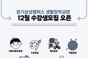 (누리일보) 경기문화재단 경기상상캠퍼스(대표이사 유정주)는 겨울 시즌 생활창작공방 프로그램 참여자를 오는 17일부터 모집한다. 생활창작공방은 경기상상캠퍼스 생생1990에 위치한 경기생활문화센터 교육 커뮤니티 공간으로, 도민이 일상 속에서 다양한 창작 활동을 경험할 수 있도록 재단공방, 어린이창작공방, 드로잉실, 취미공방, 직물공방, 커피공방, 사진촬영실까지 총 7개의 특화 공간을 운영하고 있다. 11월에는 총 11개의 프로그램이 구성돼 있으며, 주요 프로그램으로는 △Set in wool(울조끼와 가방 만들기), △오롯이 나에게 집중하는 시간: 4주 터프팅 힐링 프로젝트, △내 생애 첫 그림- 알기 쉬운 민화'일월오봉도', △그림책 마음 놀이터 등이 있다. 12월에는 △오일파스텔로 만드는 2026년 달력 △우리들의 예술놀이터, △복을 담는 라탄 복조리 만들기, △복을 쓸어 담는 모시 빗자루 만들기, △커피의 감별과 추출 방법: 커핑까지 총 5개의 프로그램이 운영될 예정이며, 수강 신청은 11월 14일부터 각 프로그램 시작 4일 전까지 경기상상캠퍼스 누리집을 통해 가능하다. 경기상상캠퍼스 내 생활창작공