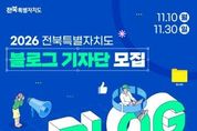 (누리일보) 전북특별자치도는 도 공식 블로그 ‘전북의 재발견’에서 활동할 2026년 블로그 기자단을 11월 10일부터 30일까지 모집한다. 기자단은 전북의 일상과 여행지, 문화, 생활 정책 등 다양한 지역 소식을 콘텐츠로 제작해 도민과 블로그 방문객에게 소개하는 온라인 홍보 역할을 맡게 된다. 모집 인원은 총 30명으로, 전북에 관심 있는 누구나 지원 가능하다. 합격자는 다음 달 10일 발표되며, 선발된 기자단은 2026년 1월부터 12월까지 1년간 활동하게 된다. 활동 기간 동안 기자단은 월간 온라인 기획회의와 기획 취재 등을 통해 도내 현장을 직접 방문해 취재 콘텐츠를 작성한다. 기자단에게는 작성한 콘텐츠에 대한 원고료가 지급되며, 전북도가 주최하는 행사 및 프로그램에 우선 참여할 수 있는 기회도 제공된다. 또한 활동 실적이 우수한 기자에게는 별도의 인센티브가 부여된다. 김선경 전북특별자치도 소통기획과장은 “블로그 기자단은 도정을 비롯한 전북의 매력을 사람과 현장 중심 이야기로 전달하는 중요한 소통 창구”라며 “전북을 사랑하고 콘텐츠 제작에 관심 있는 분들의 많은 참여를 기대한다”고 말했다.