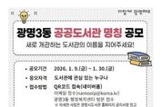 (누리일보) 광명시가 광명3동 새 도서관의 이름을 지어줄 주인공을 찾는다. 시는 올해 10월 개관 예정인 ‘광명3동 공공도서관’ 명칭 공모를 9일부터 30일까지 22일간 진행한다고 9일 밝혔다. 광명3동 공공도서관은 광명3동 공공복합청사(광명동 104-9) 내 지상 5~6층에 연면적 1천600㎡ 규모로 조성ᅟᅡᆫ다. 어린이·종합 자료실을 비롯해 실감 놀이터, 어린이 창작공간, 강의실, 동아리실 등 전 세대가 함께 이용할 수 있는 복합문화공간으로 운영할 예정이다. 이번 명칭 공모는 도서관이 시민의 일상과 가장 가까운 생활 문화공간으로 자리 잡을 수 있도록, 공간의 성격과 가치를 잘 담아내면서도 모두에게 친숙한 이름을 찾기 위해 마련했다. 명칭의 적합성, 창의성, 대중성 등을 종합적으로 평가해 최우수상 1건(10만 원), 우수상 1건(7만 원), 장려상 1건(5만 원)을 선정하고, 온누리상품권으로 시상할 계획이다. 선정 결과는 오는 2월 중 광명시도서관 누리집에서 공개한다. 명칭 공모는 도서관에 관심 있는 누구나 참여할 수 있다. 온라인 양식을 작성해 제출하거나, 광명3동 행정복지센터로 방