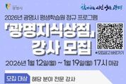 (누리일보) 광명시 평생학습원이 시민 맞춤형 평생학습 프로그램 ‘광명지식상점’을 운영할 2026년도 전문 교육 강사를 공개 모집한다. ‘광명지식상점’은 시민의 삶과 밀접한 주제를 중심으로 배움과 성장을 지원하는 광명시 대표 평생학습 프로그램이다. 2026년에는 ▲미래기술 ▲직무역량 ▲재무설계 ▲인문성찰 ▲관계학습 ▲시민학습 ▲기타 제안과정 등 7개 분야에서 강사를 선발해 시민들에게 다채로운 교육 서비스를 제공할 예정이다. 지원 자격은 해당 모집 분야의 전문성을 보유하고 관련 자격증과 실무경력을 모두 갖춘 자에 한한다. 시는 강의 경력, 강의계획서, 자기소개서 등을 바탕으로 1차 서류심사를 진행한 뒤, 수업 시연과 질의응답으로 구성된 2차 면접심사를 거쳐 최종 40여 명의 강사를 선발할 계획이다. 접수는 오는 12일부터 19일 17시까지 이메일 또는 평생학습원 2층 사무실 방문을 통해 가능하다. 제출 서류 등 세부 사항은 광명시 평생학습플랫폼 ‘광명이(e)지’ 공지사항에서 확인할 수 있다. 최종 합격자는 2월 중 ‘광명e지’에서 발표하며, 선발된 강사진은 3월부터 본격적으로 시작되는 ‘광